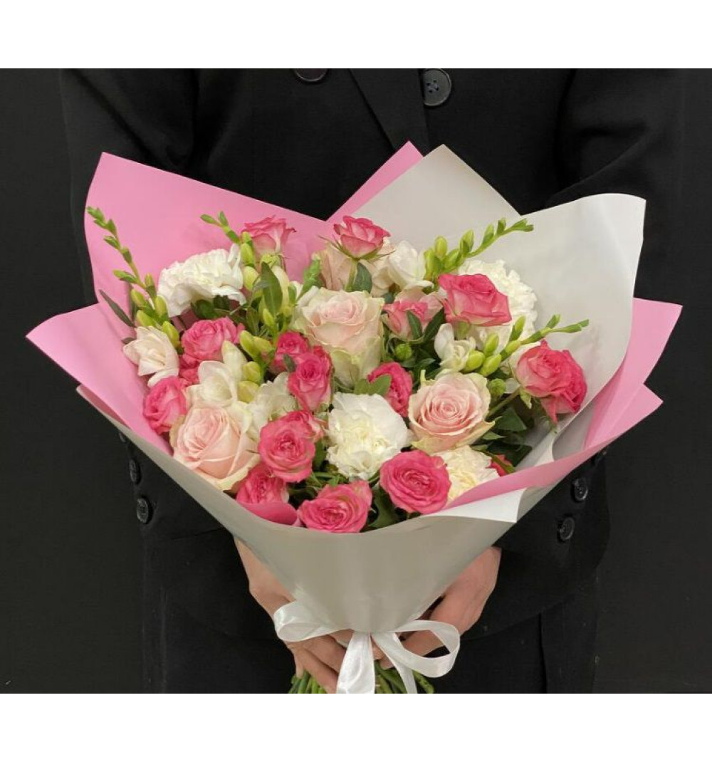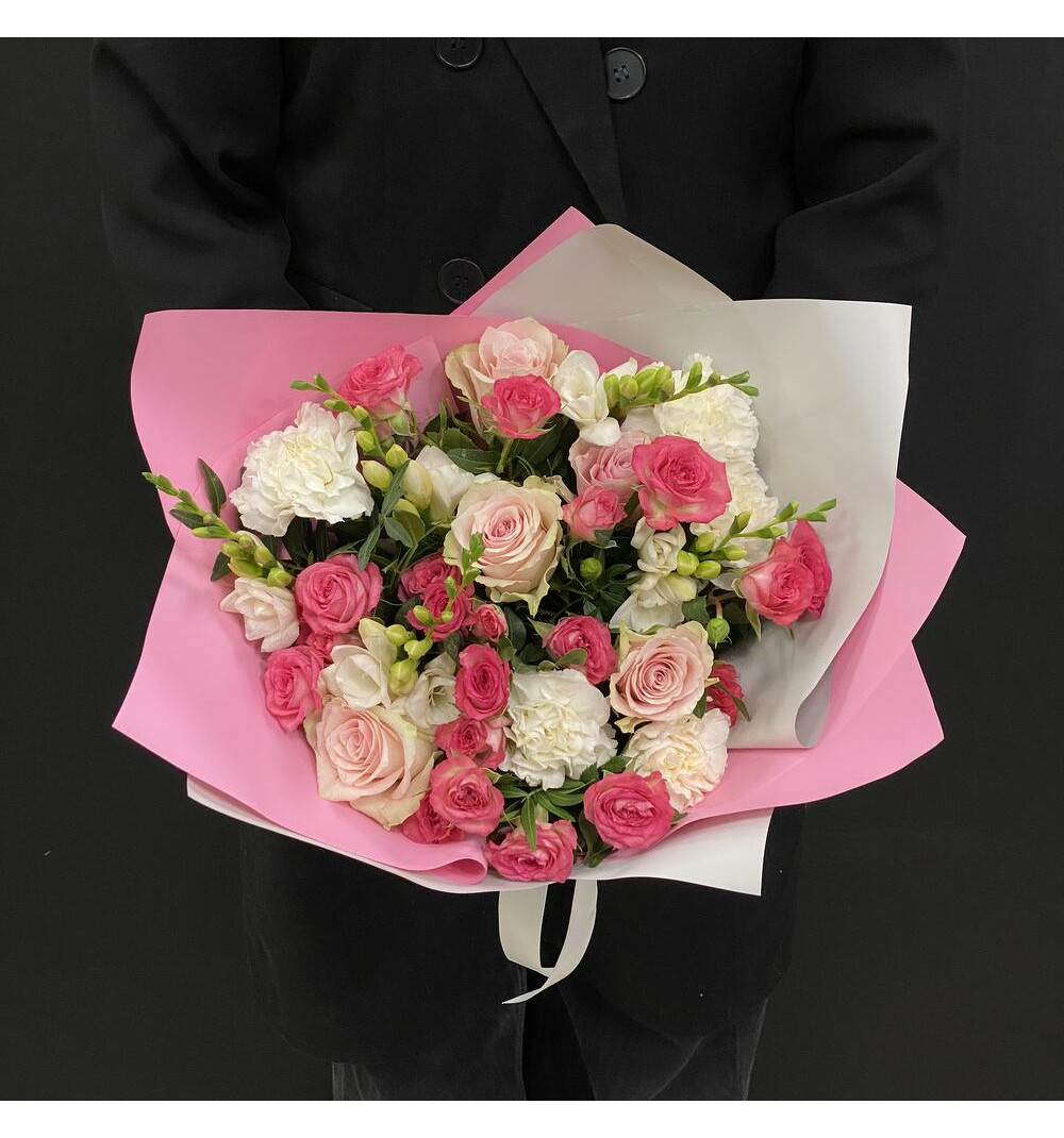 Изысканный букет из роз, фрезий, гвоздик и фисташки, представлен в стильной дизайнерской упаковке. Эта уникальная композиция в нежных оттенках создаст атмосферу романтики и красоты. Идеальный выбор для особых моментов, чтобы подарить радость и улучшить настроение.