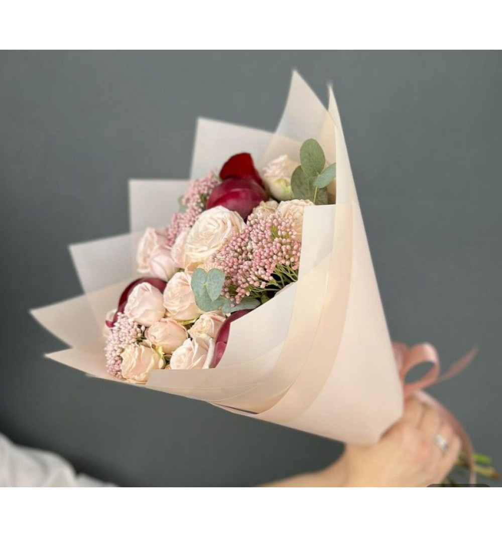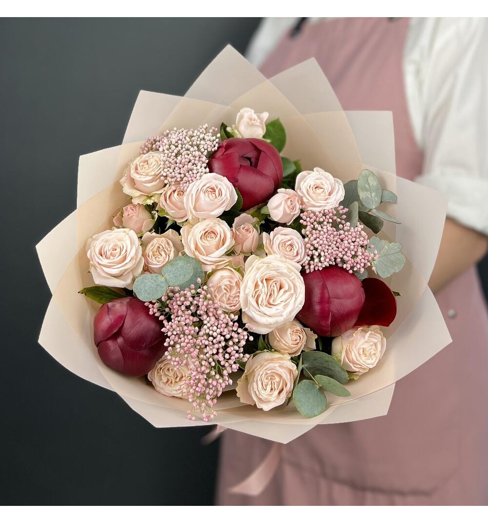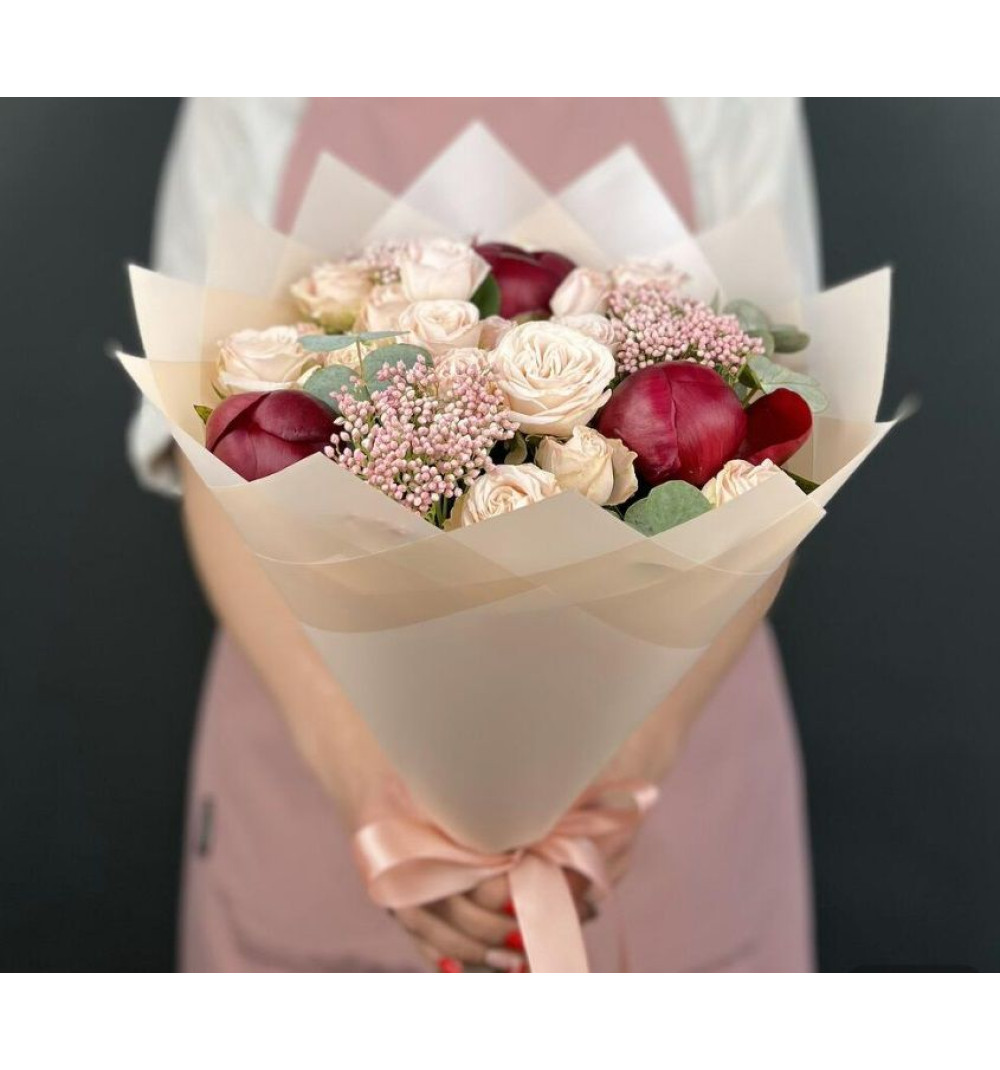 Купить Авторский букет из красных Пионов и кремовых кустовых Роз с Озотамнусом в Каскелене за 20 000 ₸ | интернет-магазин «Guls»