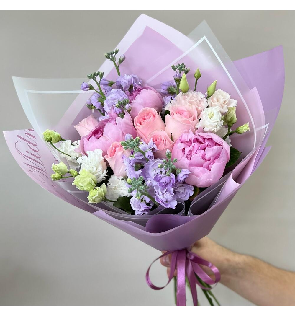 Изящный букет с нежным сочетанием пионов, лизиантуса, маттиолы лаванда и эквадорских одноголовых роз. Он окутан стильной дизайнерской упаковкой, придающей ему особенную элегантность и шарм. Этот уникальный букет станет прекрасным подарком для особых моментов, чтобы выразить любовь и принести радость вашим близким.