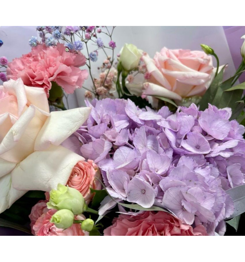 Композиция "Лавандовый сон" — волшебный букет, наполненный нежностью и мечтательностью. В его состав входят ароматные гортензии, прекрасные розы и кустовые розы, которые создают романтическую атмосферу. Завершают образ букета белые эустомы, эвкалипт Baby Blue и гипсофила радужная. Упаковка дизайнерского исполнения дополняет образ, придаёт букету элегантность и уникальность. Этот букет станет прекрасным подарком для особых моментов и событий, чтобы подчеркнуть нежность чувств и передать пожелания тепла и счастья.