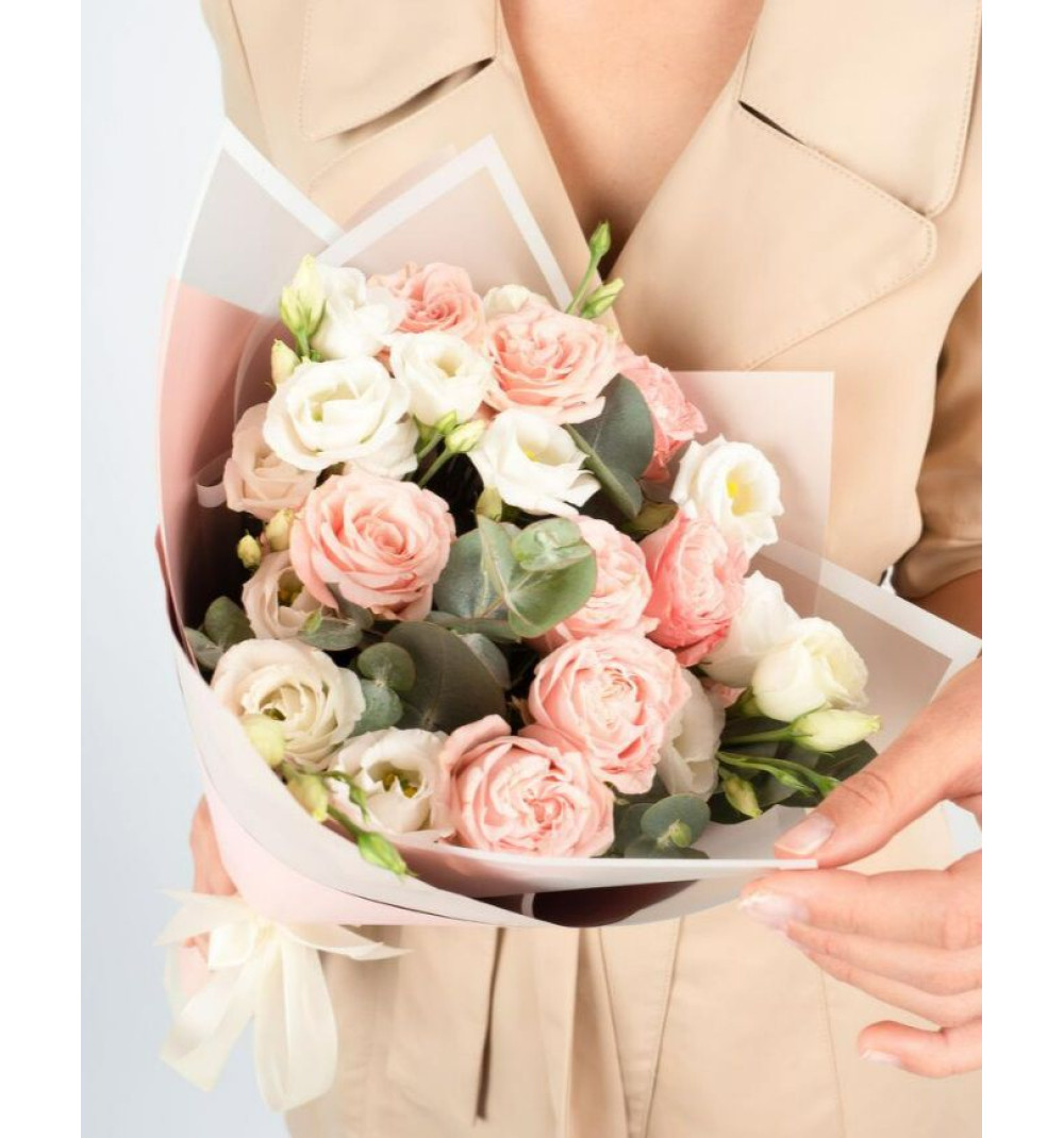 Авторский букет с пионовидной розой и эустомой