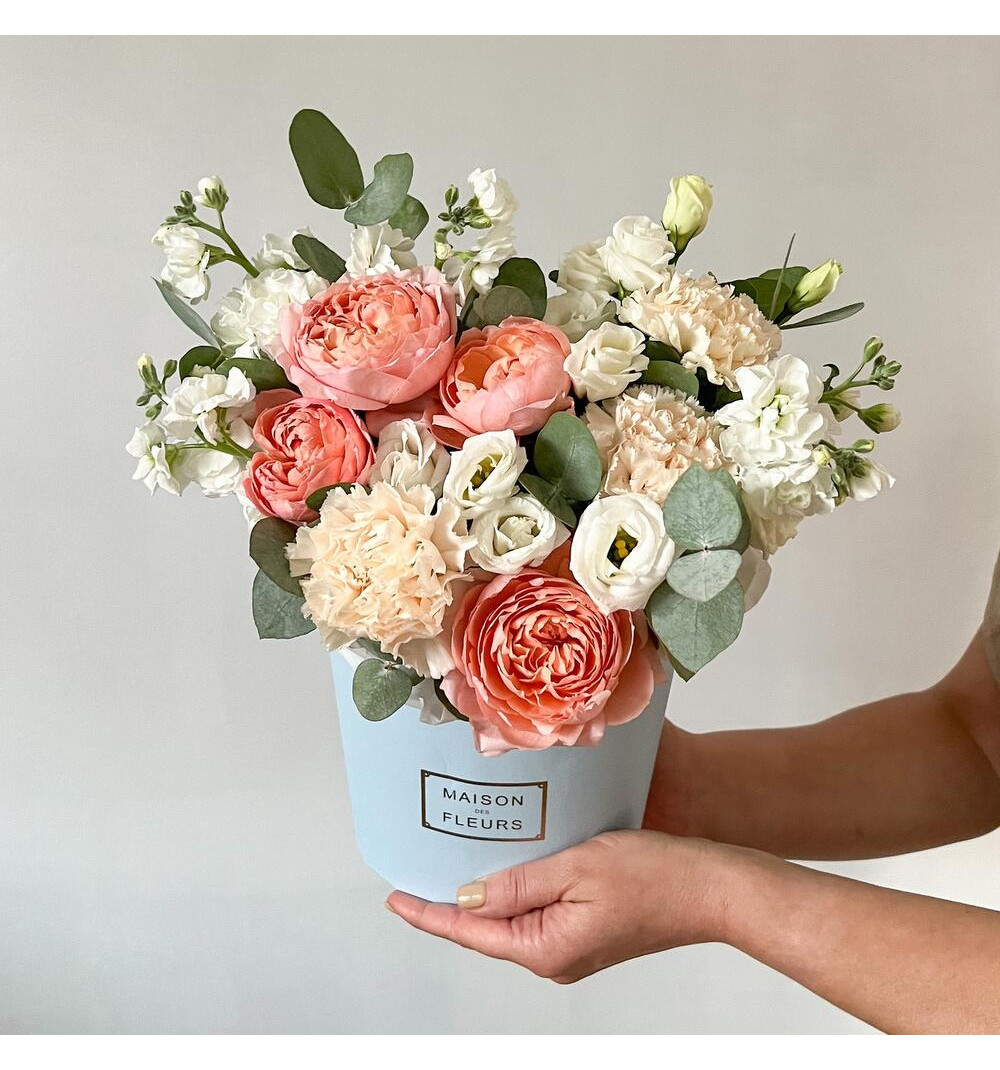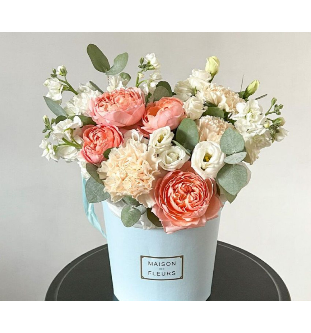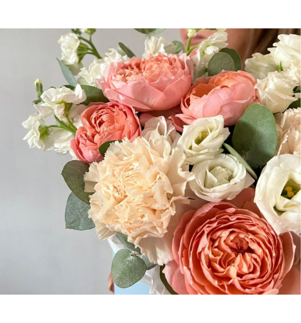 Купить Композиция с персиковыми пионовидными розами и маттиолой. в Каскелене за 25 000 ₸ | интернет-магазин «Guls»