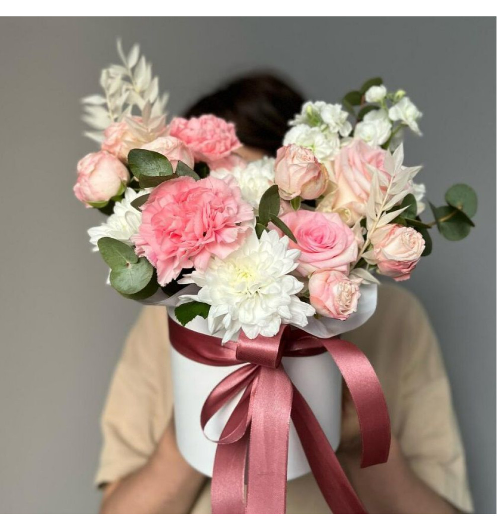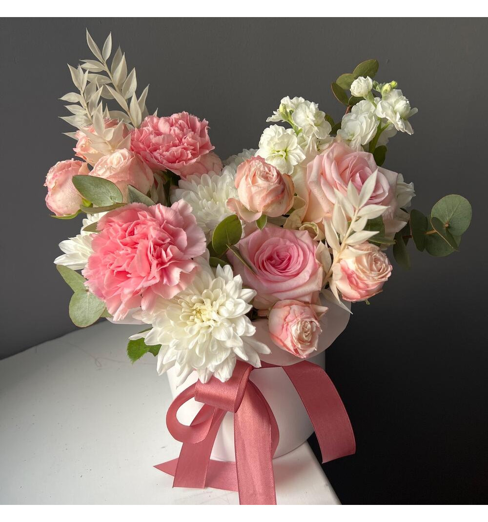 Купить Кустовые пионовидные розы, маттиола и хризантема в шляпной коробочке в Каскелене за 15 000 ₸ | интернет-магазин «Guls»