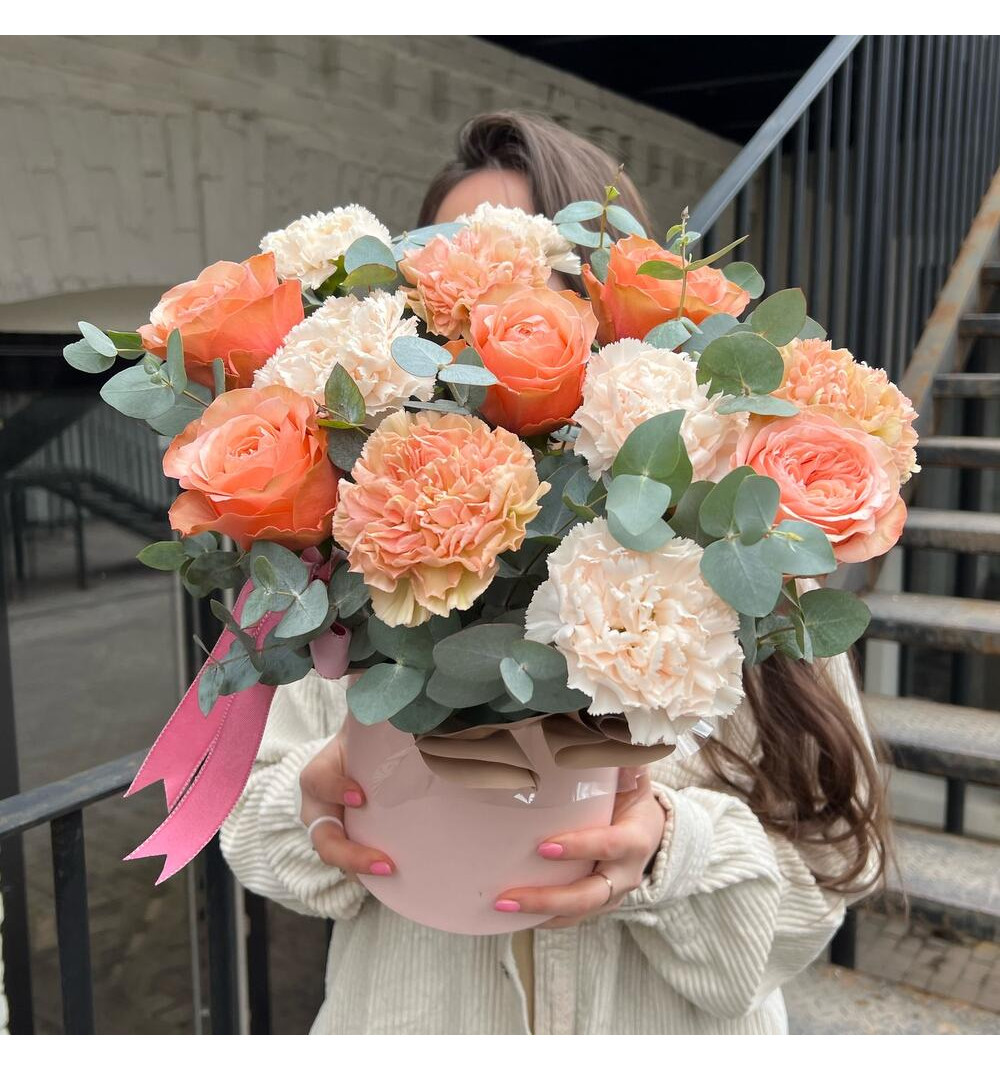 Композиция "Медовый" - это утонченное сочетание свежих эвкалиптовых веточек, нежных диантусов, и изысканных роз пионовидной формы кахала. Каждый элемент букета тщательно подобран, чтобы создать гармоничное и восхитительное впечатление. Коробка в стиле шляпной придает композиции особую изысканность и позволяет с легкостью подарить эту красоту своим близким и любимым. Букет "Медовый" - прекрасный выбор для создания атмосферы тепла и нежности в особенные моменты жизни.