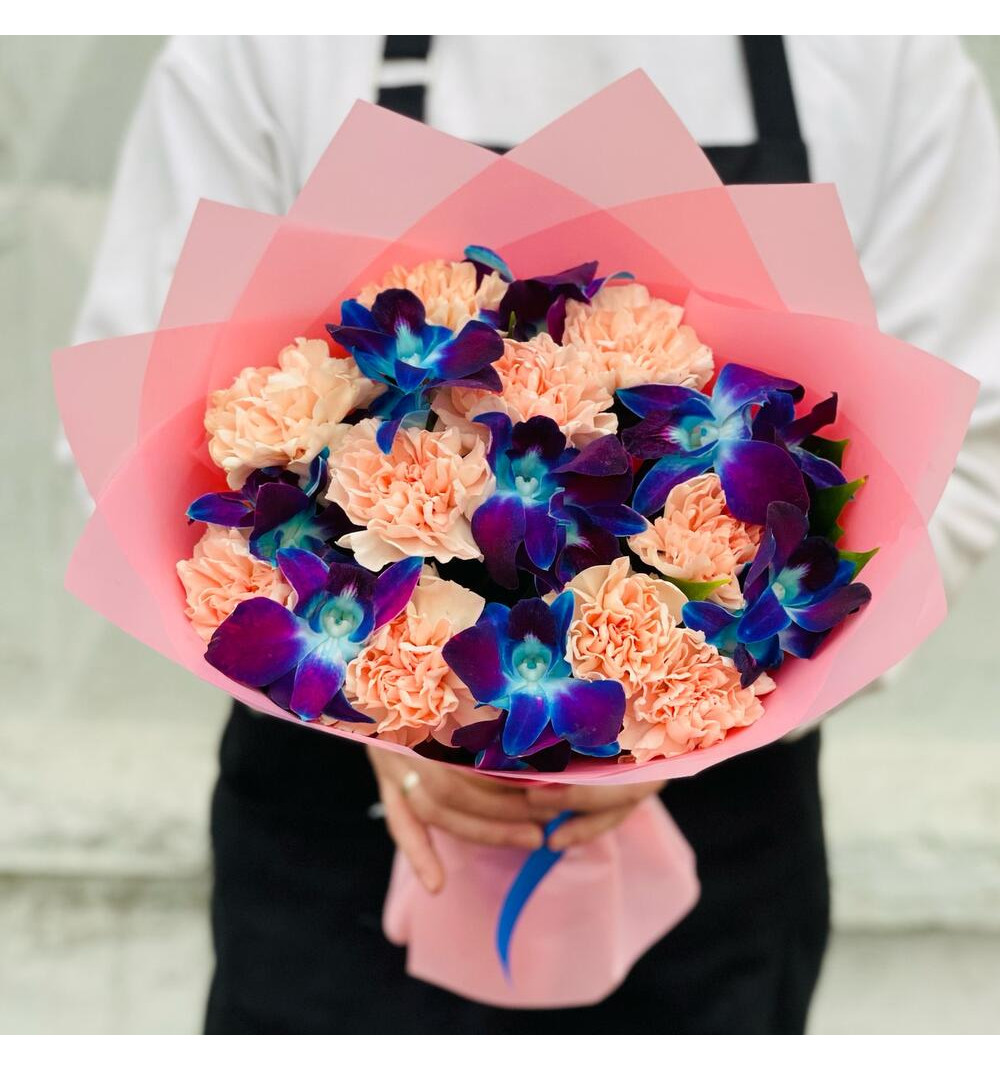 Это прекрасное сочетание изящных орхидей и нежных диантусов, собранных в одном уникальном букете. Орхидеи известны своей изысканной красотой и грациозностью, а диантусы добавляют свежести и ярких красок. Этот авторский букет создан с любовью и заботой, чтобы порадовать получателя и создать атмосферу радости и умиротворения. Изысканный выбор цветов делает этот букет прекрасным подарком на любой особенный случай или просто для выражения своих чувств и благодарности.