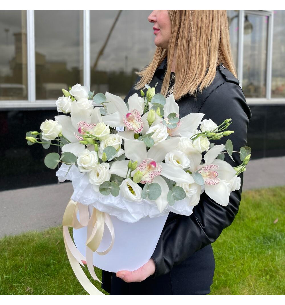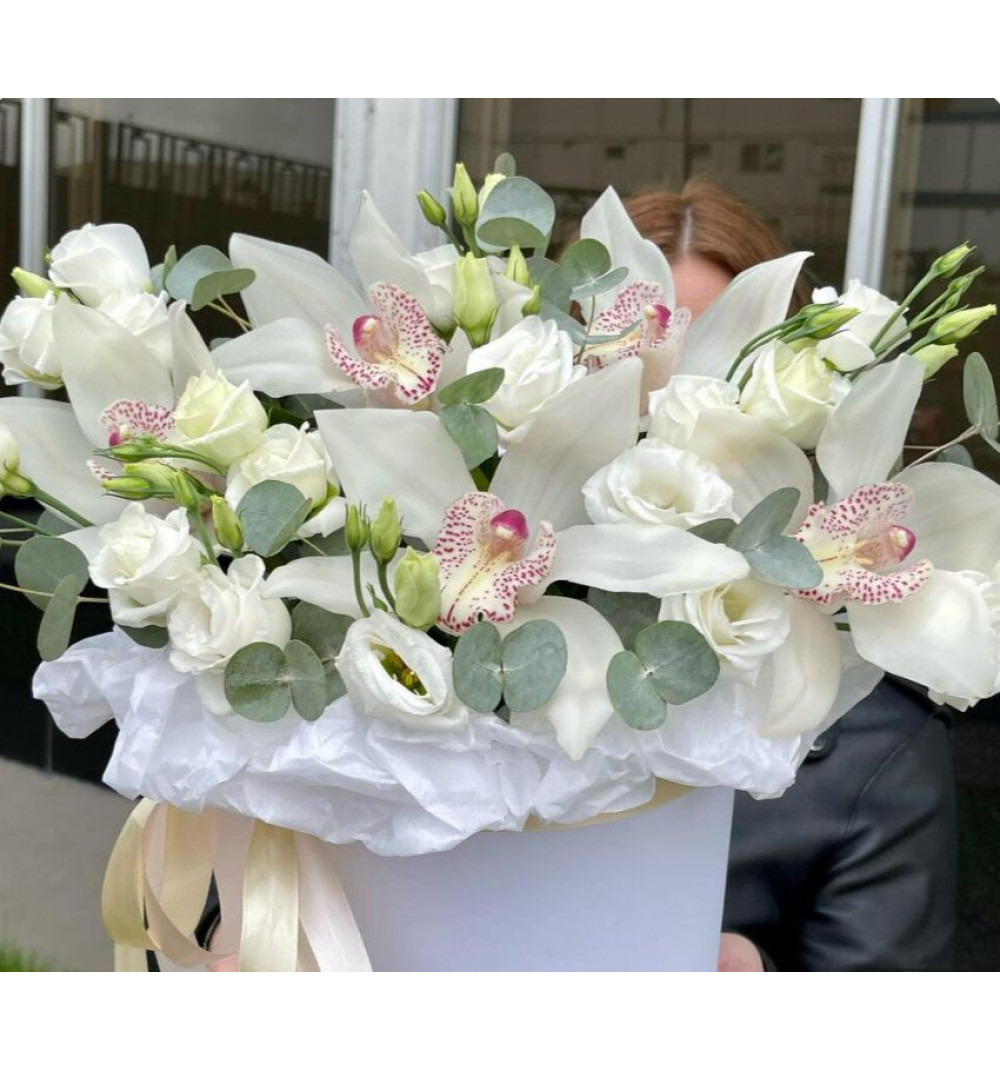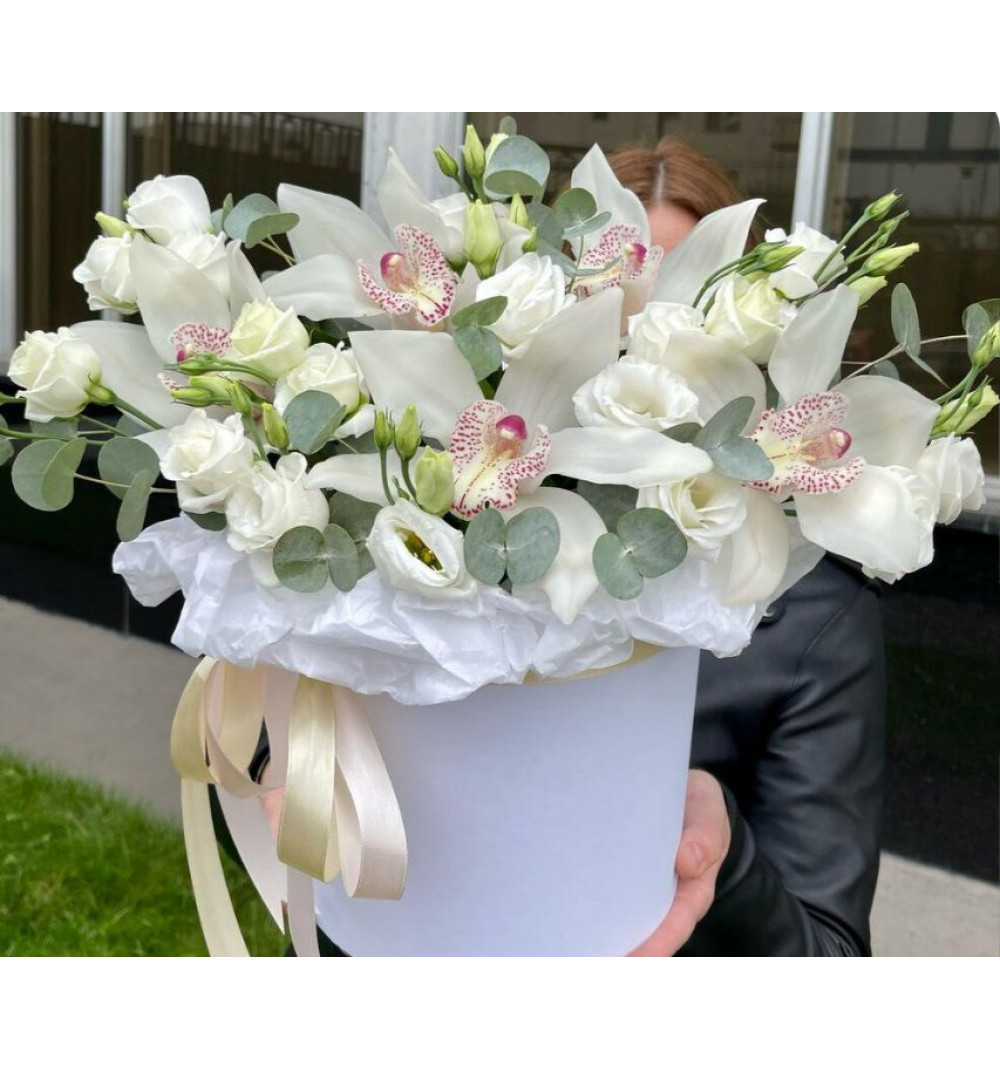Купить Орхидея белая с эустомой в коробочке в Каскелене за 25 000 ₸ | интернет-магазин «Guls»