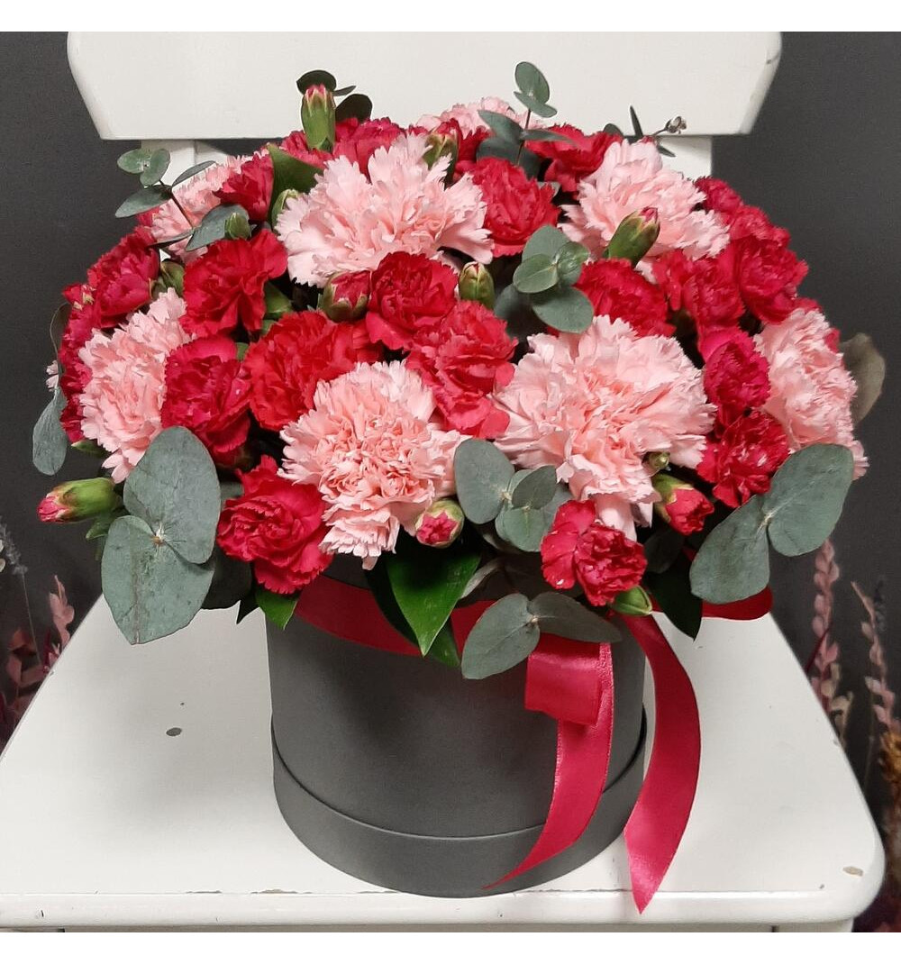 Яркая кустовая и нежно коралловая гвоздика в шляпной коробке